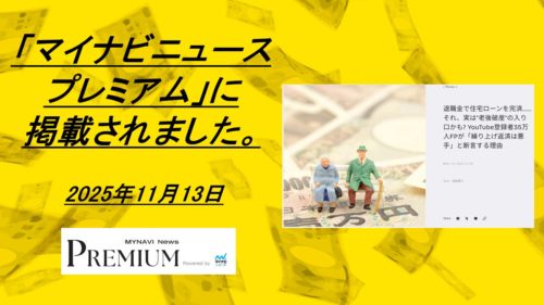 マイナビニュース プレミアムに退職金で住宅ローンを完済……それ、実は“老後破産”の入り口かも? YouTube登録者35万人FPが『繰り上げ返済は悪手』と断言する理由が掲載されました