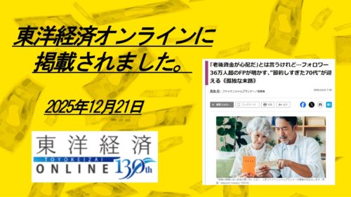 東洋経済オンライン にて「老後資金が心配だ」とは言うけれど…フォロワー36万人超のFPが明かす、”節約しすぎた70代”が迎える《孤独な末路》が掲載されました
