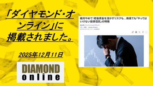 ダイヤモンド・オンラインにて絶対やめて!老後資金を溶かすリスクも…株高でも「やってはいけない投資信託」の特徴が掲載されました
